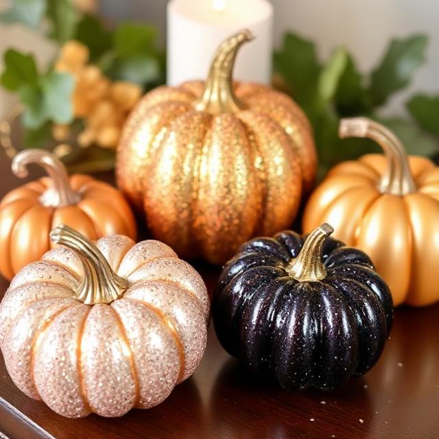 Add a touch of sparkle using glitter paint, metallic finishes, or gold leaf. These make elegant centerpieces or porch decorations.